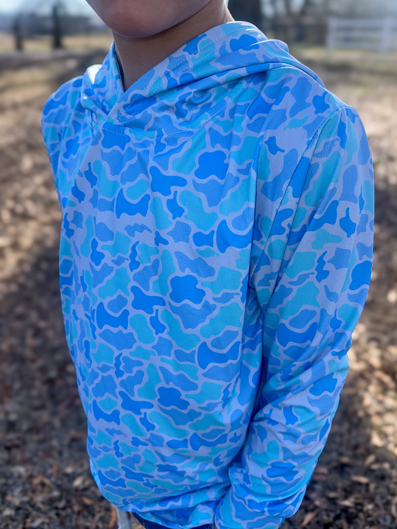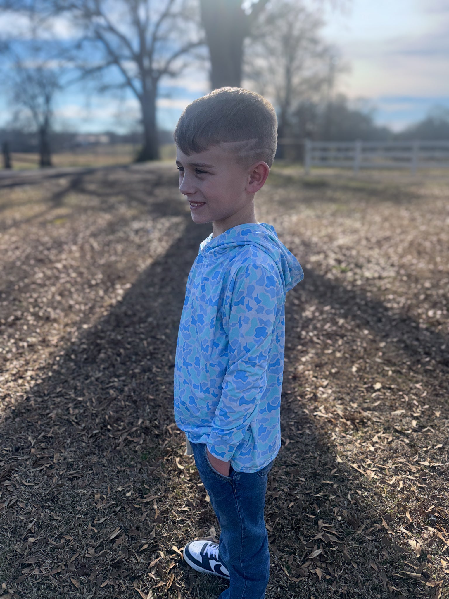 Our newest camo print features cool coastal blues that give all the fishing + outdoor vibes while still being perfect for everyday play.