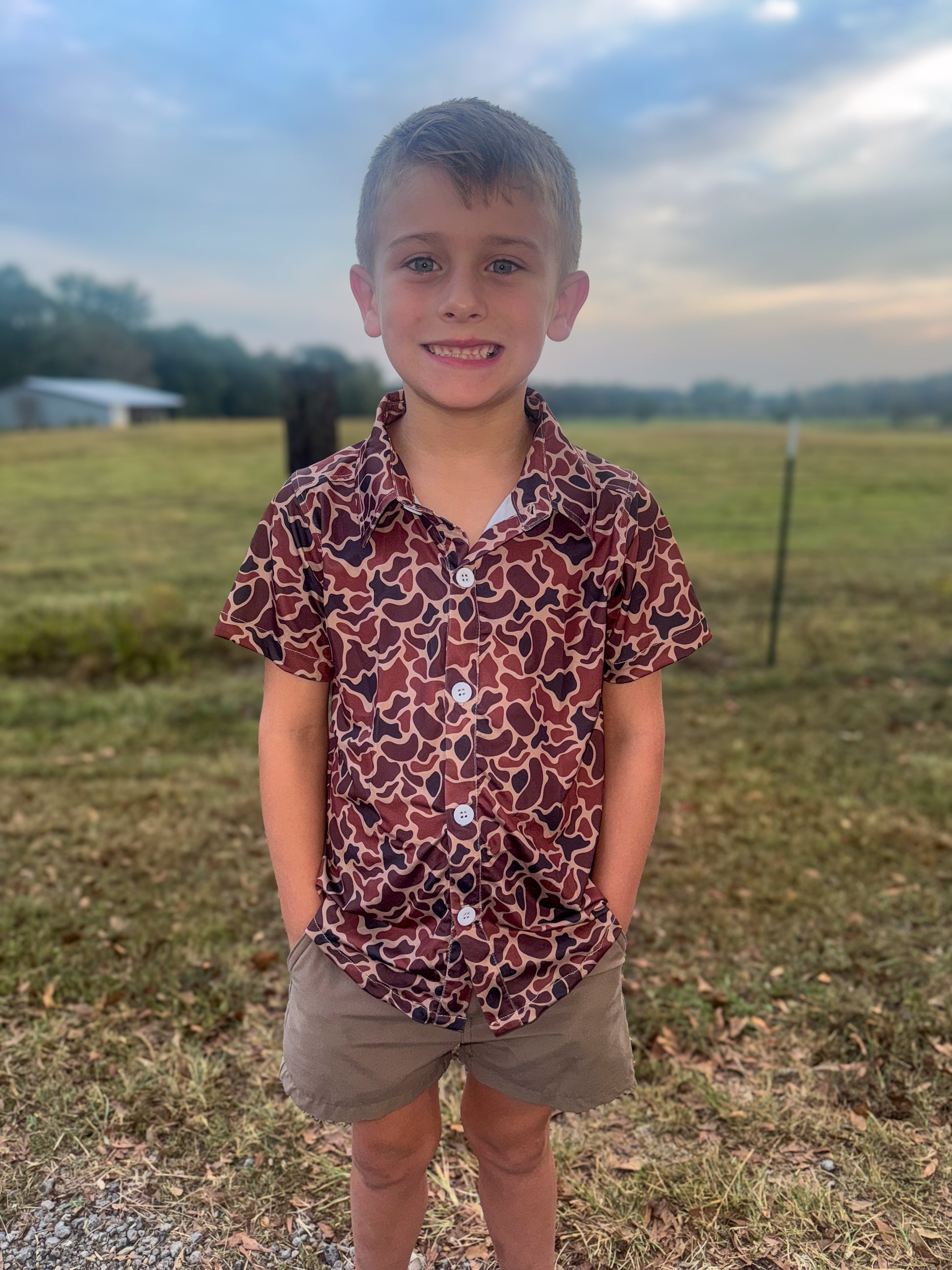 Stay protected and comfortable in our Woodland Camo shirt. With UPF 50, moisture-wicking, and quick-drying, this button-down is perfect for active outdoor boys. Blend in and stand out at the same time.